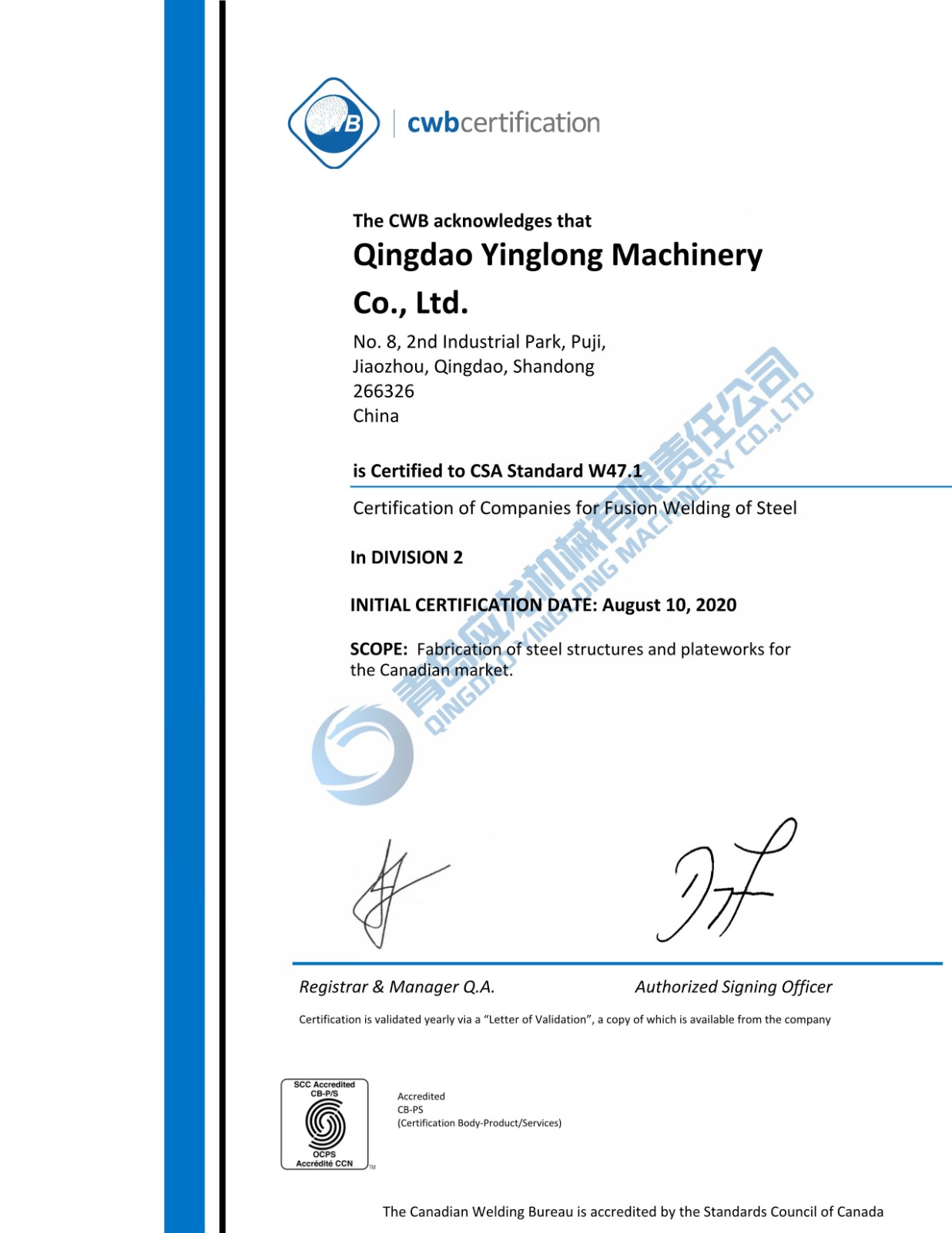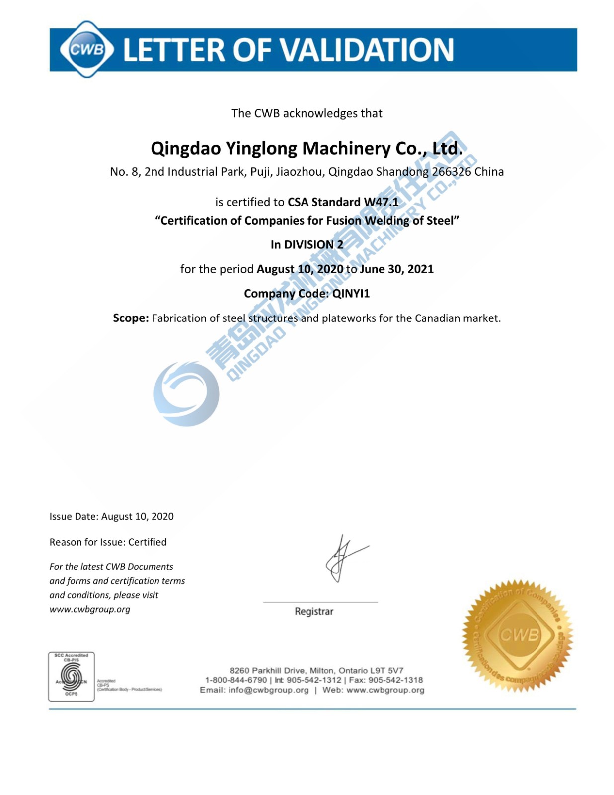 2020年8月11日,青島應(yīng)龍收到加拿大焊接局發(fā)來(lái)的CWB認(rèn)證證書,公司順利通過(guò)加拿大CWB認(rèn)證。